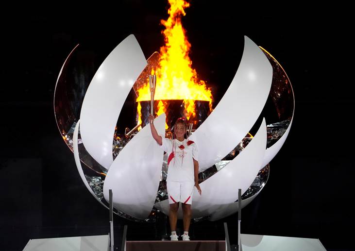 Uma das canções que tocou após o Desfile das Nações foi Michio Yamagami e Kunihiko Murai, “Tsubasa o Kudasai”, como tocada em Evangelion, Dragon Ball Z: Broly – O Lendário Super Saiyan, K-ON!, Nichijou e outros animes. A música que acompanhou a entrada da tocha olímpica foi “Boléro” de Maurice Ravel – uma famosa peça clássica muito antes inclusas em animes, como Legend of the Galactic Heroes: My Conquest is the Sea of Stars, Digimon e Hibike! Euphonium The Movie – Our Promise: A Brand New Day usaram. A jogadora de tênis Naomi Osaka acendeu a chama olímpica.