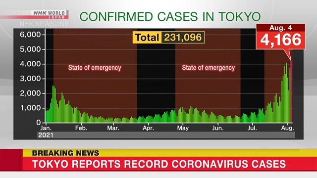 Tóquio relatou 4.166 novos casos na quarta-feira, superando o recorde anterior de 4.058 casos em 31 de Julho. As autoridades de Tóquio afirmaram que 115 pessoas estavam em estado grave, três a mais que no dia anterior.
