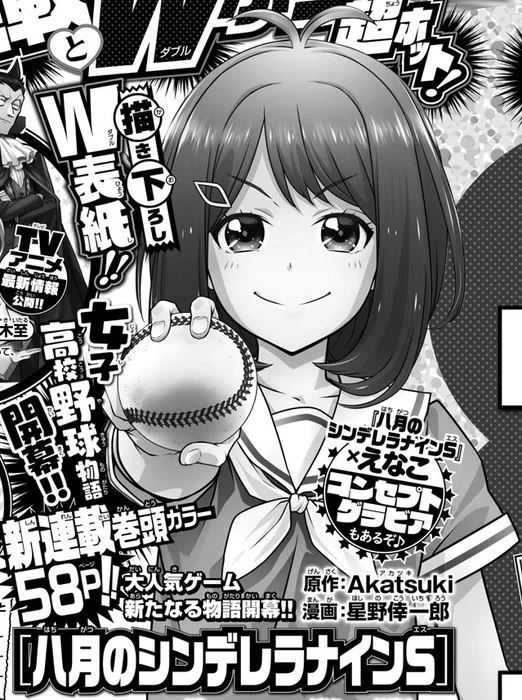 A edição combinada 36 e 37 deste ano da revista da Akita Shoten, Weekly Shonen Champion anunciou em 5 de Agosto que a franquia original de games de smartphones da Akatsuki e Kadokawa, Hachigatsu no Cinderella Nine está inspirando um novo mangá intitulado Hachigatsu no Cinderella Nine S que vai começar a ser lançado na próxima edição da revista em 19 de Agosto. Kōichirō Hoshino está desenhando o mangá, que será uma história totalmente nova centrada em uma jogadora de beisebol novata do ensino médio chamado Asu Suzumura.
