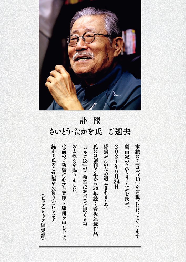 A editora Shogakukan anunciou nesta quarta-feira (29/09) que o criador do mangá Golgo 13, Takao Saito faleceu no dia 24 de Setembro de câncer no pâncreas. Ele tinha 84 anos de idade.