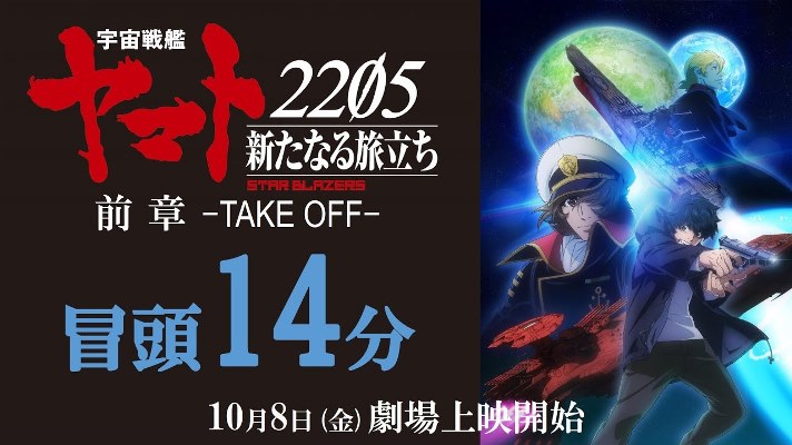 O site oficial para as versões modernas do anime Star Blazers: Space Battleship Yamato divulgou nesta semana um vídeo com os primeiros 14 minutos de Uchuu Senkan Yamato 2205: Aratanaru Tabidachi – Zenshou -TAKE OFF-, o primeiro dos dois filmes do projeto sequência Uchuu Senkan Yamato 2205: Aratanaru Tabidachi (Space Battleship Yamato 2205: A New Voyage). O site também postou uma imagem dos seis membros que estão se juntando à tripulação. O mesmo visual estará em um bilhete antecipado do MoviTicke Card que estará à venda no dia 8 de Outubro para o segundo filme.