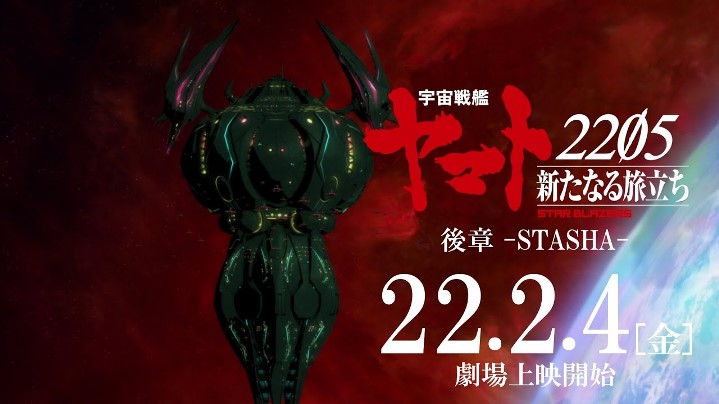 O site oficial para as versões modernas do anime Star Blazers: Space Battleship Yamato divulgou nesta sexta-feira (15/10) um teaser em vídeo para Uchuu Senkan Yamato 2205 : Aratanaru Tabidachi – Koushou -STASHA- (Space Battleship Yamato 2205: The New Voyage Part II: Stasha), o segundo filme dos dois planejados de Uchuu Senkan Yamato 2205: Aratanaru Tabidachi (Space Battleship Yamato 2205: A New Voyage). O vídeo revela que o filme vai ser lançado em 4 de Fevereiro 2022 nos cinemas do Japão.