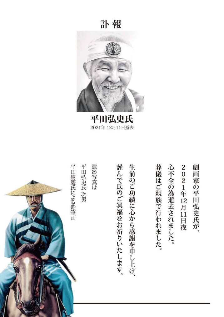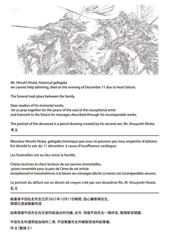 O site oficial do criador do mangá Hiroshi Hirata anunciou na quinta-feira (16/12) que Hirata faleceu em 11 de Dezembro devido a um problema cardíaco. Um funeral foi realizado para parentes próximos. Ele tinha 84 anos. Seu segundo filho, Atsuyoshi Hirata, desenhou um retrato a lápis como uma homenagem: