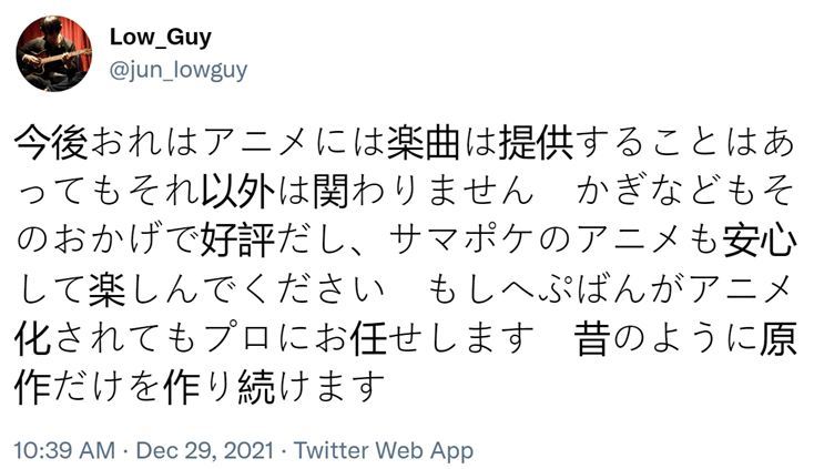 Depois de ficar um tempão sumido, ele apareceu… mais ou menos. Em duas atualizações feitas pela conta do Twitter Low_Guy (@jun_lowguy), que foi descoberta como uma conta alternativa do popular escritor e compositor Jun Maeda, que havia se afastado do público nos últimos meses, foram compartilhadas em um fórum de comentários popular no Japão. Como você pode remover postagens assim que souber que elas foram descobertas, os fóruns salvaram as mensagem em prints e compartilharam. A primeira foi feita em 28 de Dezembro de 2021, onde explicou o que havia acontecido com ele nos últimos meses: