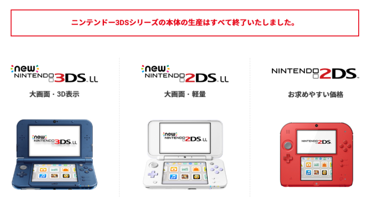 O Nintendo 3DS foi lançado em Fevereiro de 2011. A variante Nintendo 3DS XL foi lançada em 2012 e a variante Nintendo 2DS foi lançada em 2013 (2016 no Japão). O New Nintendo 3DS, juntamente com sua variante XL, foi lançado em 2014 no Japão e em 2015 na América do Norte. A variante New Nintendo 2DS XL foi lançada em Julho de 2017. A Nintendo cessou a produção da plataforma portátil em 2020.