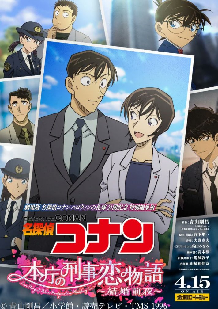O anime Detective Conan receberá uma compilação especial para comemorar a estreia de Detective Conan: The Bride of Halloween (Meitantei Conan: Halloween no Hanayome), o 25º filme anime da franquia. O especial Meitantei Conan: Honchо̄ no Keiji Monogatari ~Kekkon Zenya~ (Detetive Conan: Love Story at Police Headquarters ~Wedding Eve~) se concentrará no romance entre os personagens Wataru Takagi e Miwako Sato, que também são centrais no próximo filme. O especial vai ao ar na NTV em 15 de Abril, mesmo dia em que o filme estreia nos cinemas.