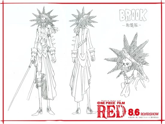 A conta oficial do Twitter para o próximo filme de anime One Piece Film Red revelou os designs de personagens de “battle wear” para o filme na quarta-feira (23/03). O próprio Oda desenhou os designs, que têm um tema de “rock x piratas” e apresentam couro e tachas para uma vibração de armadura da Idade Média.