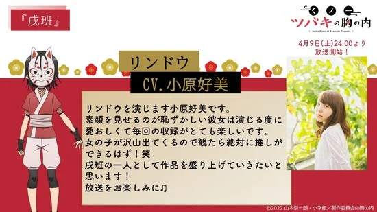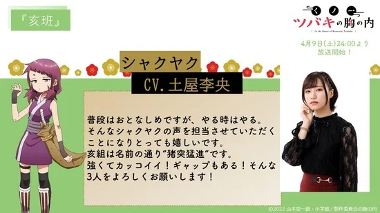 A conta no Twitter para o anime TV baseado no mangá de Sōichirō Yamamoto, In the Heart of Kunoichi Tsubaki (Kunoichi Tsubaki no Mune no Uchi) revelou mais sete membros do elenco no domingo (03/04), segunda-feira (04/04) e terça-feira (05/04):