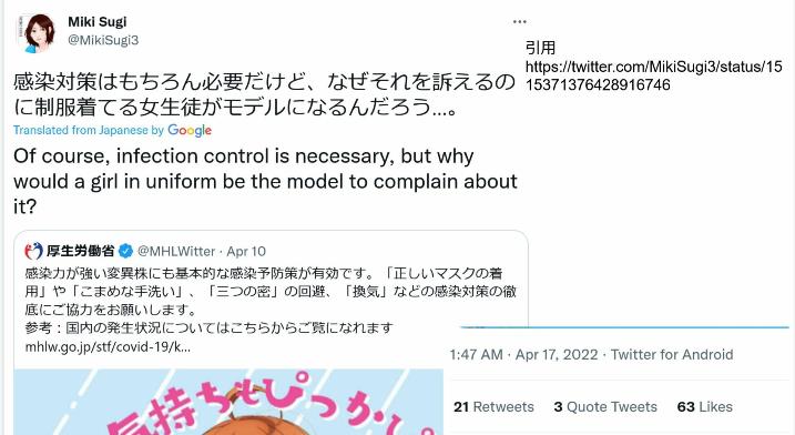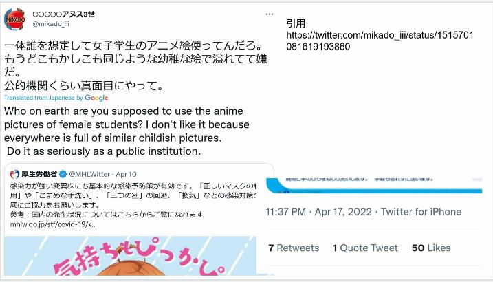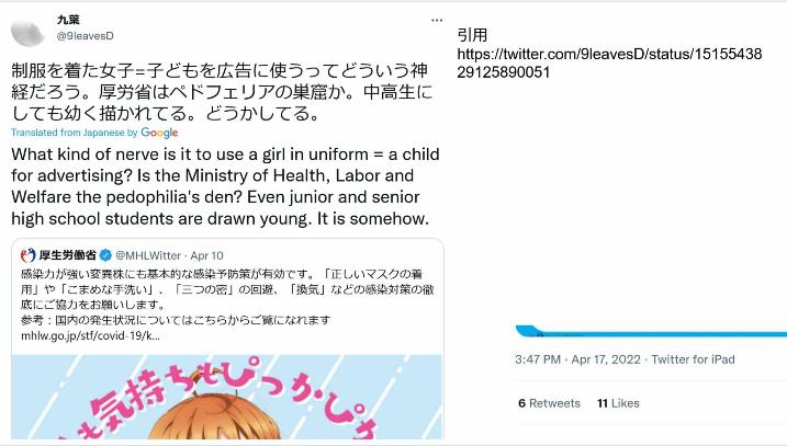 “Que tipo de crença é usar meninas de uniforme, ou seja, menores, na publicidade? O Ministério da Saúde, Trabalho e Bem-Estar do Japão é um antro de pedofilia? Eles são apresentados como jovens, mesmo para alunos do ensino fundamental e médio. O que acontece?”.