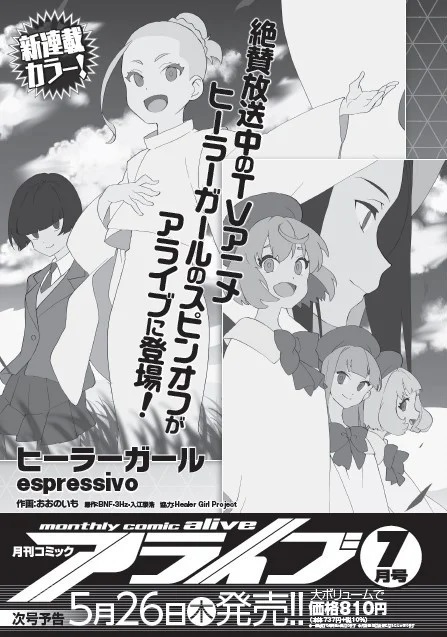 A edição de Junho da revista da Kadokawa, Monthly Comic Alive revelou na quarta-feira (27/04) que o anime de produção original do Studio 3Hz, Healer Girl, “uma nova forma ousada de animação musical de cura”, vai ganhar um mangá spinoff intitulado Healer Girl espressivo que será lançado na próxima edição da revista em 26 de Maio. Imo Ōno desenhará o mangá.