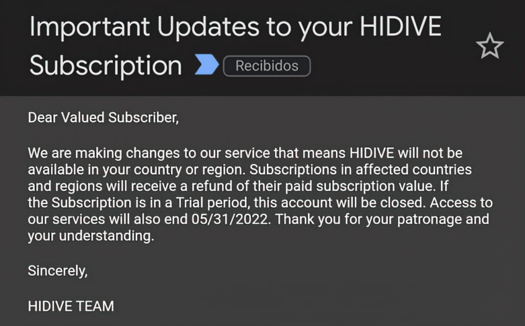 Uma informação começou a ser compartilhada nas redes sociais nesta quarta-feira (25/05) na qual usuários de diferentes países da América Latina relataram terem recebidos e-mails de que o serviço de streaming da Sentai Filmworks, HIDIVE, não prestará mais serviço nos países latino-americanos a partir do dia 31 de Maio. Esta informação também foi compartilhada por usuários do Brasil.