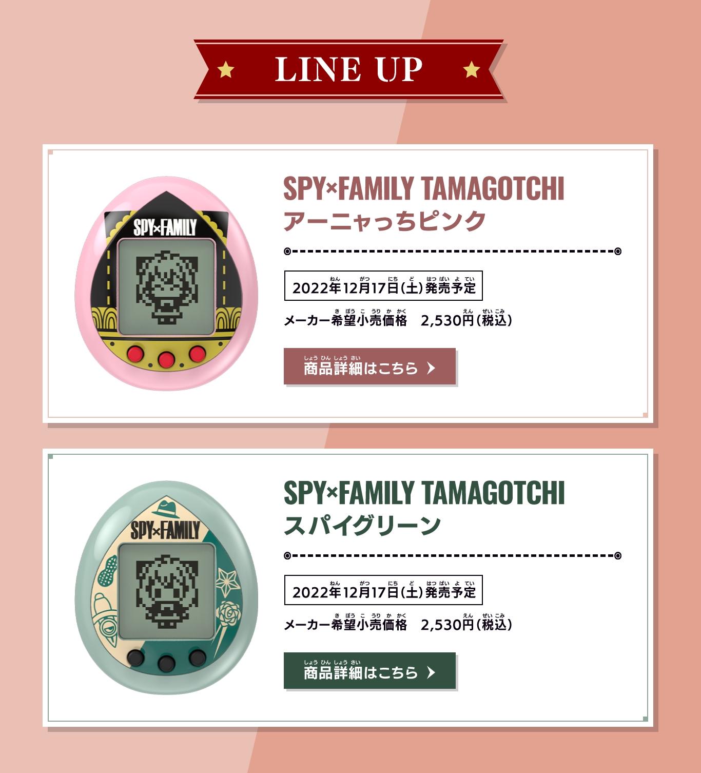 Os Tamagotchis da Anya vêm em 2 versões, rosa (Anyacchi Pink) e verde (Spy Green):