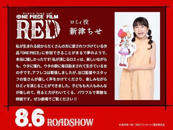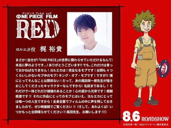 O site oficial para o novo filme da franquia One Piece, One Piece Film Red revelou dois novos membros do elenco para o filme na quarta-feira (13/07). Os novos membros do elenco são: