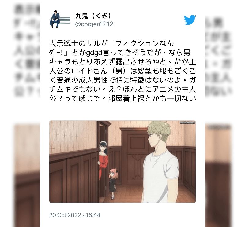 A usuária do Twitter, “九鬼 (くき) (corgen1212)”, que se descreve como uma feminista japonesa, apareceu nos fóruns de comentários no Japão depois que ela compartilhou uma longa crítica à “sexualização” da personagem Yor Forger da adaptação em anime do mangá de Tatsuya Endo, SPY x FAMILY, em relação a suas roupas expostas e seios grandes.