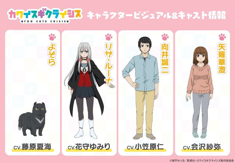 A conta oficial no Twitter para a adaptação em anime do mangá Kawaisugi Crisis (Too Cute Crisis) de Mitsuru Kido anunciou nesta quinta-feira (03/11) membros do elenco.