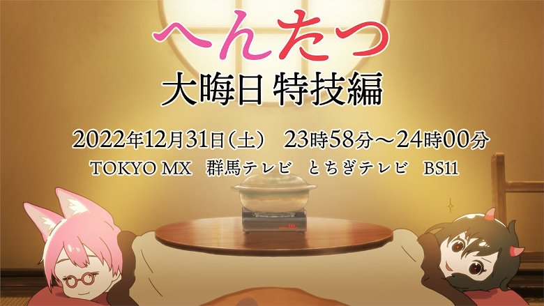 TATSUKI e Irodori anunciaram no Twitter no sábado (24/12) que Hentatsu Ōmisoka Tokugi-Hen (Hentatsu New Year’s Eve Specialty Edition) irá ao ar na Tokyo MX, Tochigi TV, Gunma TV e BS11 na véspera de Ano Novo das 23h58 até meia-noite. O anúncio não informa se o anime será novo e TATSUKI também adverte que não terá um anúncio importante ou notícias semelhantes.