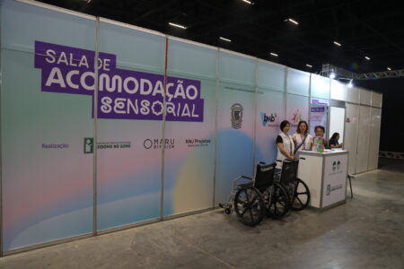 O espaço teve apoio da Redragon Brasil e parceria da Therapedia Equipamentos Profissionais, BmB Terapêuticos e SensoryLand, oferecendo itens como abafadores anti-ruído e cordões crachás de autismo.