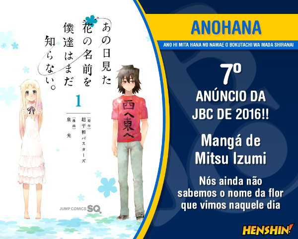 Eita, mais um mangá para o catalogo da editora JBC, para alegria de muitos, dessa vez ela traz Anohana, mais uma opção chegando!