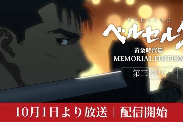 A Crunchyroll transmite Berserk: The Golden Age Arc – Memorial Edition versão para TV da trilogia de filmes de 2012-2013 a partir de 1º de Outubro.