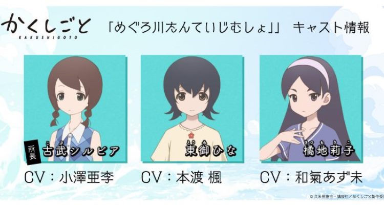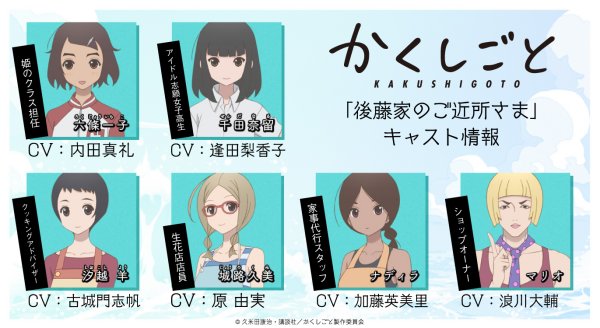 Maaya Uchida, Emiri Katō, Daisuke Namikawa, Rikako Aida , Shiho Kokido e Yumi Hara se juntam ao elenco de Kakushigoto, que estréia em Abril 2020
