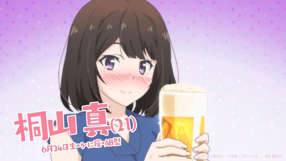 Takunomi. Mangá sobre jovens mulheres que desfrutam de boa comida e bebidas inspirou um anime TV que estreou em Janeiro 2018.